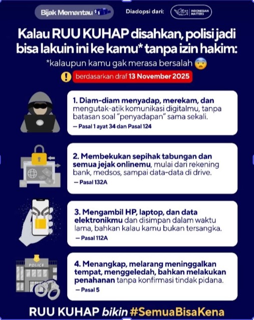 - Terkait Penyadapan (Pasal 136 ayat (2) RUU KUHAP) [Draft 18 November 2025] Perlu ditekankan memang benar bahwa pengaturan penyadapan akan diatur lebih lanjut dalam UU. Namun perlu ditekankan bahwa Pasal 136 telah menyatakan bahwa untuk kepentingan penyidikan, penyidik dapat melakukan penyadapan. Tidak ada batasan jenis tindak pidana, tidak ada safeguard yang diberlakukan, selain itu tidak ada sama sekali pasal yang menjelaskan penyadapan tidak boleh dilakukan sampai dengan diundangkannya Undang-undang Penyadapan. RUU KUHAP ini justru telah melegalkan penyidik untuk melakukan penyadapan untuk semua tindak pidana. Sehingga ketakutan penyadapan akan diberlakukan tanpa batasan sama sekali adalah valid. Tentu kita tidak tau kapan UU Penyadapan akan terbit, sehingga ketidakjelasan UU tersebut akan memperburuk praktek penyadapan yang tanpa batas. Tidak ada sama sekali pasal dalam RUU KUHAP yang berusaha menjelaskan bahwa sebelum adanya UU tentang Penyadapan maka ketentuan penyadapan dalam RUU KUHAP tidak dapat dilaksanakan.