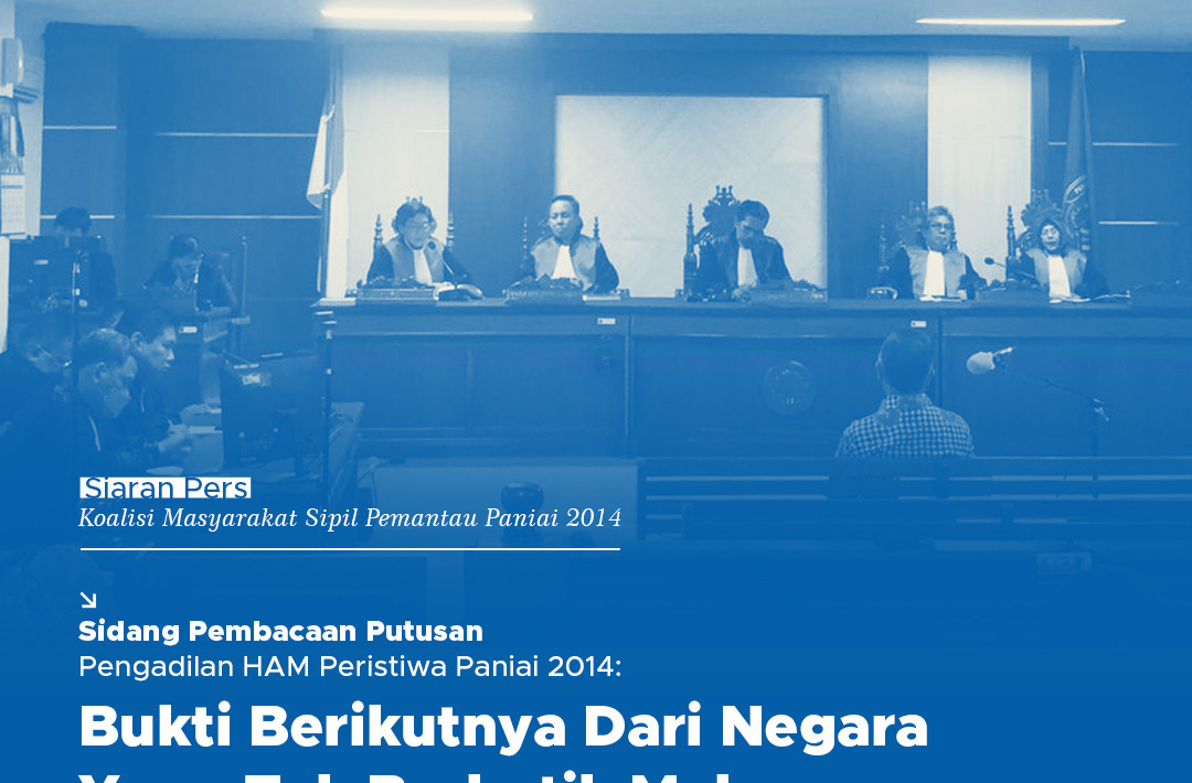 Dalam semangat solidaritas terhadap para penyintas dan keluarga korban Peristiwa Paniai 2014, serta di tengah rasa duka atas meninggalnya Yosef Youw (ayah dari Alm. Alpius Youw – korban tewas dalam peristiwa), Koalisi Pemantau Paniai 2014 menganggap vonis bebas terhadap Terdakwa tunggal (Mayor Inf Purn. Isak Sattu) di Pengadilan HAM atas Peristiwa Paniai yang berlangsung di Pengadilan Negeri Makassar adalah bukti bahwa Negara tak berkutik terhadap para penjahat HAM di Indonesia. Putusan bebas yang dibacakan oleh Majelis Hakim bertepatan dengan 8 tahun momen peringatan peristiwa ini adalah buah dari buruknya kinerja penegakan hukum untuk penuntasan pelanggaran HAM berat di Indonesia. Meski peristiwa yang terjadi di 7 – 8 Desember 2014 ini secara jelas telah memenuhi unsur kejahatan kemanusiaan sebagai pelanggaran HAM berat dalam bentuk pembunuhan dan penganiayaan, Negara tak kunjung mengungkap pelakunya. Pengadilan HAM atas Peristiwa Paniai memutus bebas terdakwa sebab dakwaan mengenai pertanggungjawaban komando tidak terbukti melekat dalam diri terdakwa. Belum ada satupun pelaku yang dihukum dari Peristiwa yang sedikitnya menewaskan 4 orang dan menyebabkan sedikitnya 10 orang luka-luka ini.